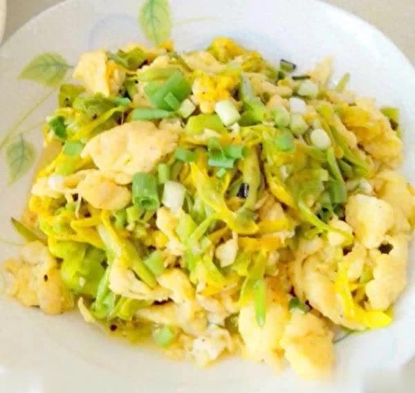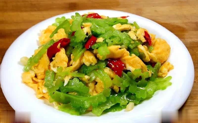 3. 锅内加入适量的植物油大火热至五分熟,加苦瓜蛋液不停翻炒直至炒熟。