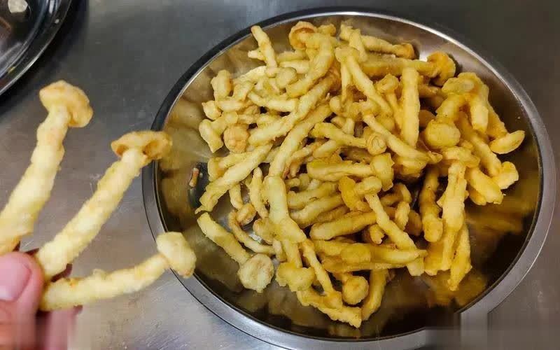 2、白玉菇冲水洗净,控干水分后拍干淀粉20克,入四成热油锅中炸至熟透。