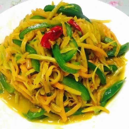 5. 加入泡发好的黄花菜干,快速翻炒均匀。