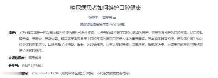 参考资料:[1]张亚平,董英芳.糖尿病患者如何维护口腔健康[J].糖尿病之友,2025.
